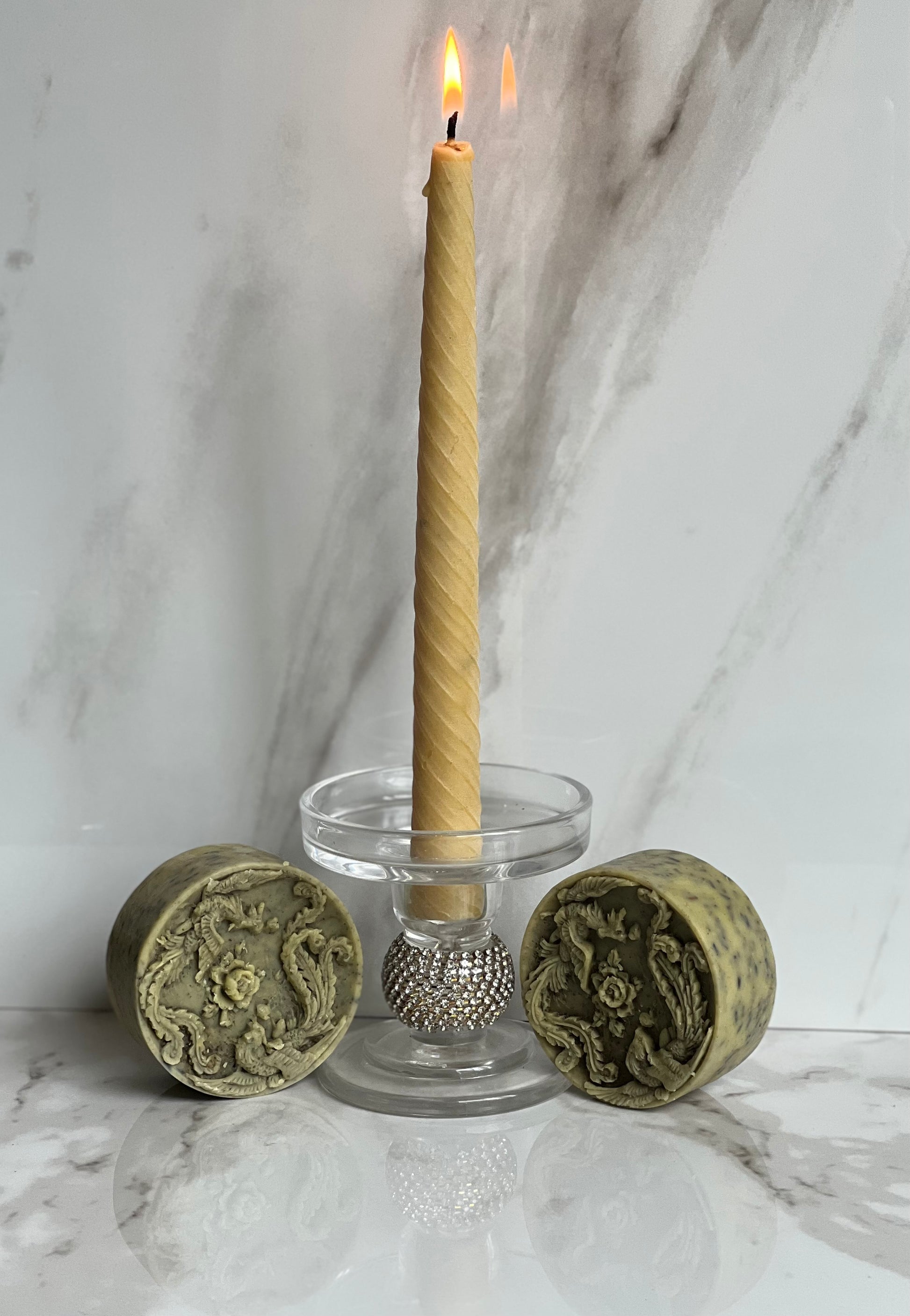 All of our beeswax taper candles are hand-poured and made with premium high-quality beeswax, dried herbs, powders, and essential oils. We are proud to say that we do not include any artificial fragrances, chemicals, or coloring dyes.